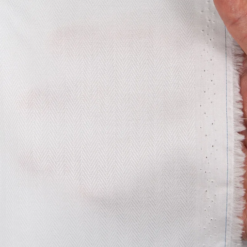 詳細光沢感のあるホワイトの細かなヘリンボーン織の綿100%イージーケア素材です。家庭洗濯+軽いアイロンがけですっきり・きっちりと着こなせる忙しいビジネスマンにぴったりの素材です。肌触りも綿100%の風合いを損なわない着心地です。