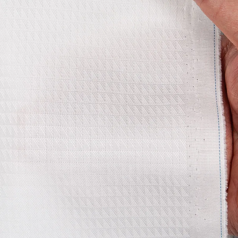 詳細光沢感のあるホワイトの細かなスクエア柄の綿100%イージーケア素材です。家庭洗濯+軽いアイロンがけですっきり・きっちりと着こなせる忙しいビジネスマンにぴったりの素材です。肌触りも綿100%の風合いを損なわない着心地です。