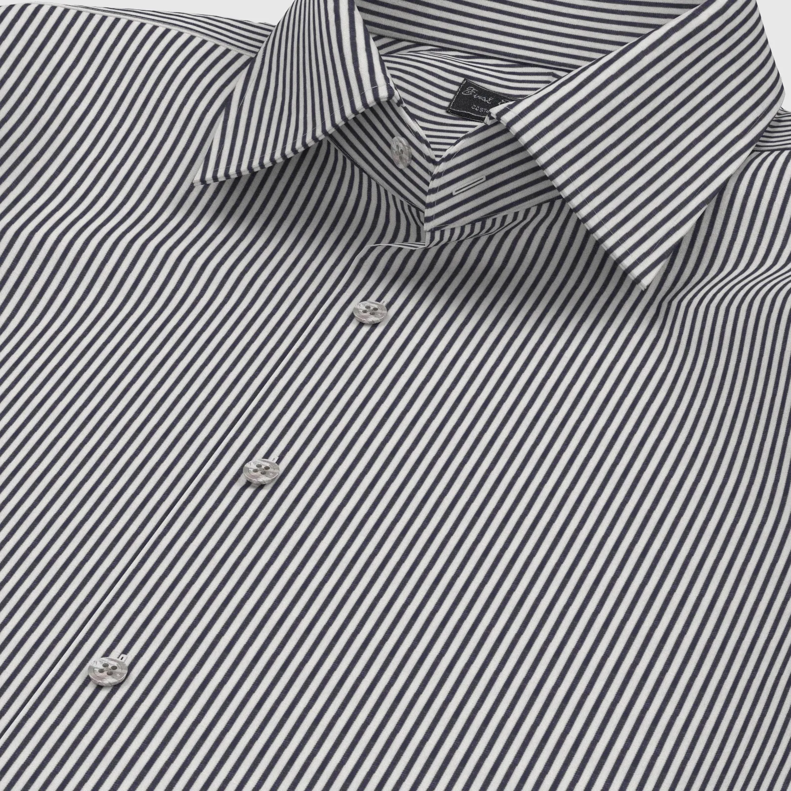 詳細上質な国産の形態安定TC(綿×ポリエステル)素材のネイビー・ロンドンストライプ生地となります。