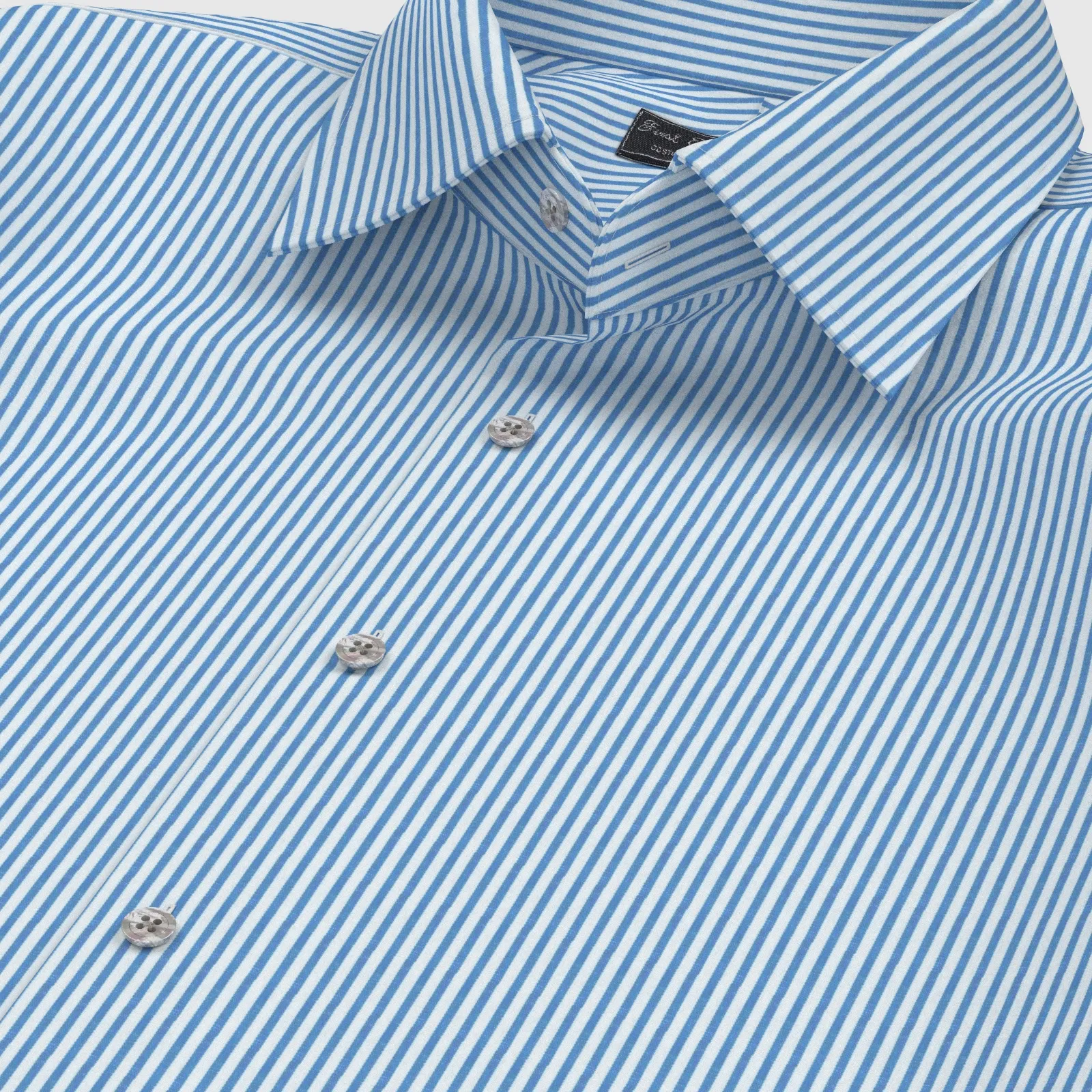 詳細上質な国産の形態安定TC(綿×ポリエステル)素材のサックス・ロンドンストライプ生地となります。