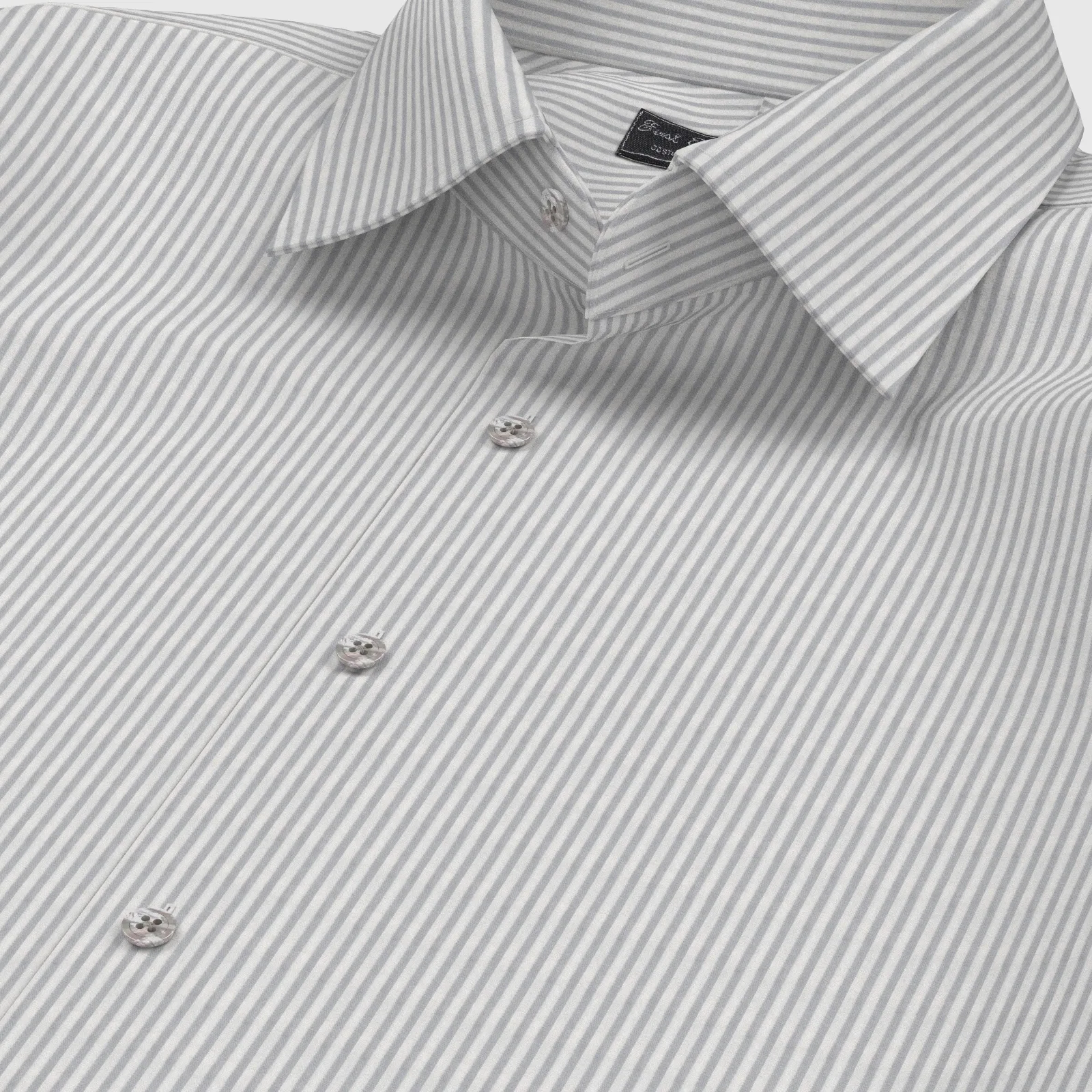 詳細上質な国産の形態安定TC(綿×ポリエステル)素材のグレー・ロンドンストライプ生地となります。