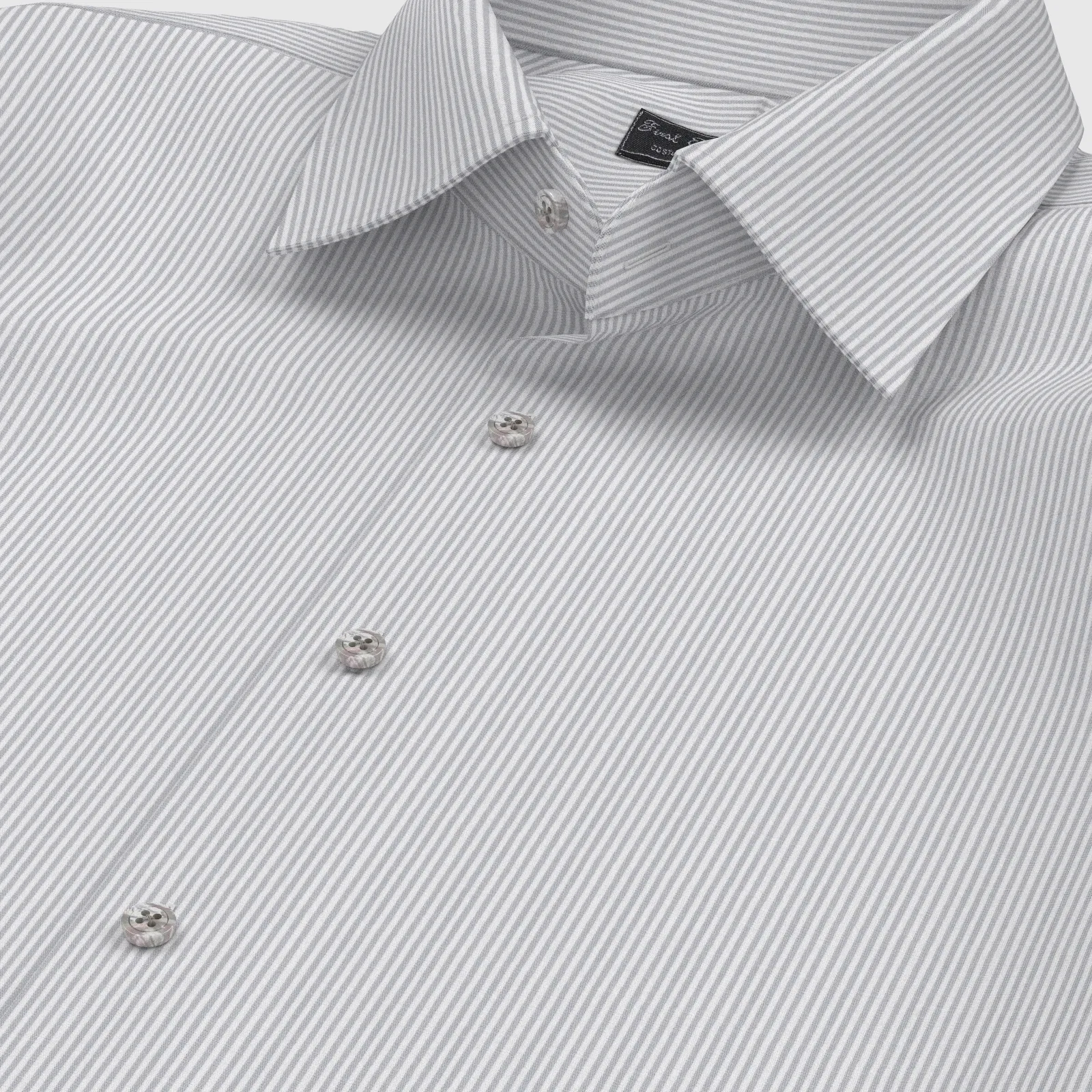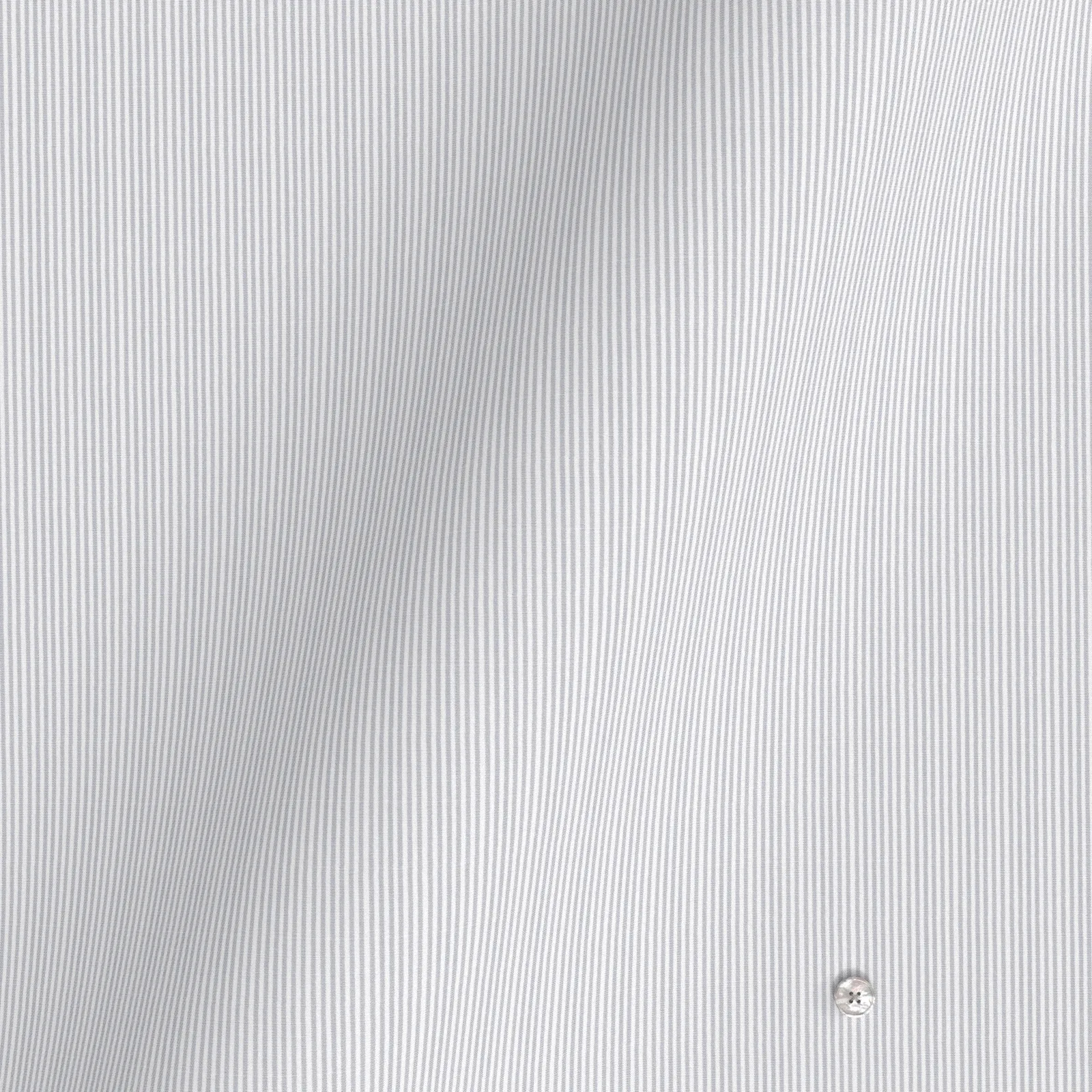詳細きれいなグレーの細めストライプの綿100%イージーケア素材です。家庭洗濯+軽いアイロンがけですっきり・きっちりと着こなせる忙しいビジネスマンにぴったりの素材です。肌触りも綿100%の風合いを損なわない着心地です。