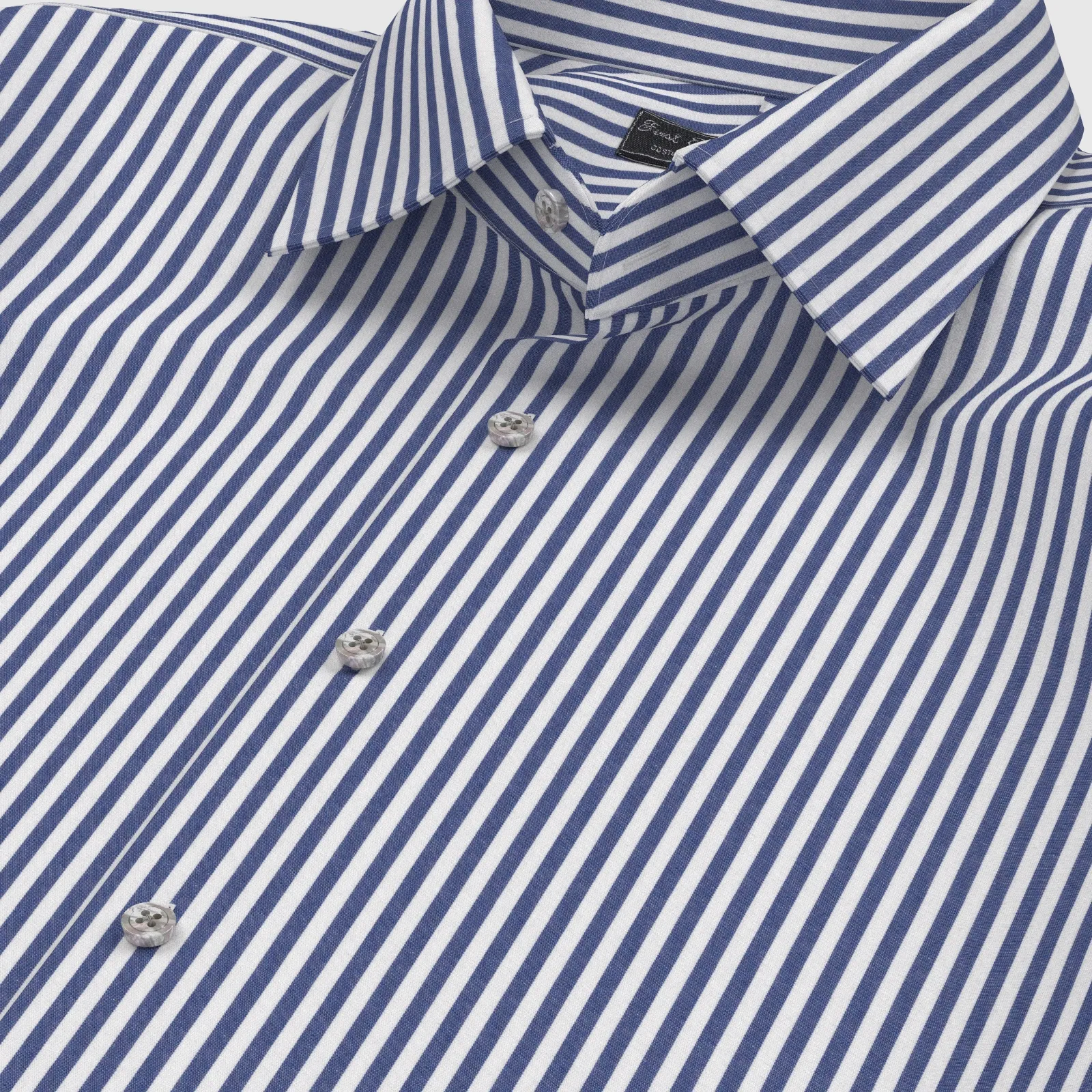 詳細きれいなネイビー・ボールドストライプの綿100%イージーケア素材です。家庭洗濯+軽いアイロンがけですっきり・きっちりと着こなせる忙しいビジネスマンにぴったりの素材です。肌触りも綿100%の風合いを損なわない着心地です。
