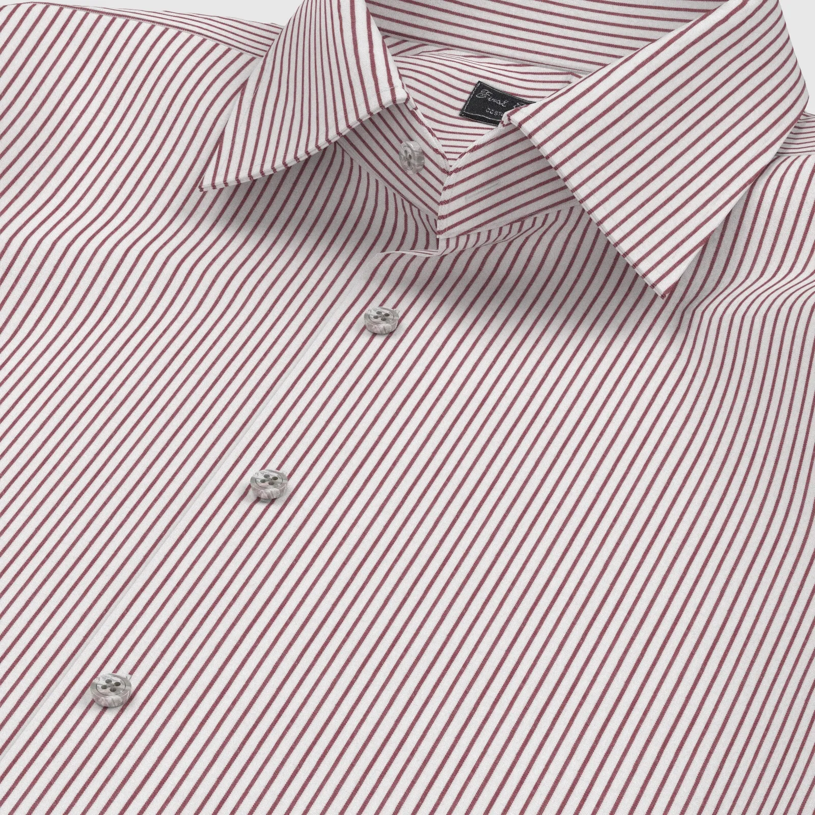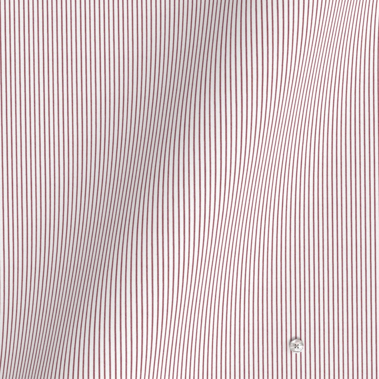 詳細きれいなレッドの細めストライプの綿100%イージーケア素材です。家庭洗濯+軽いアイロンがけですっきり・きっちりと着こなせる忙しいビジネスマンにぴったりの素材です。肌触りも綿100%の風合いを損なわない着心地です。