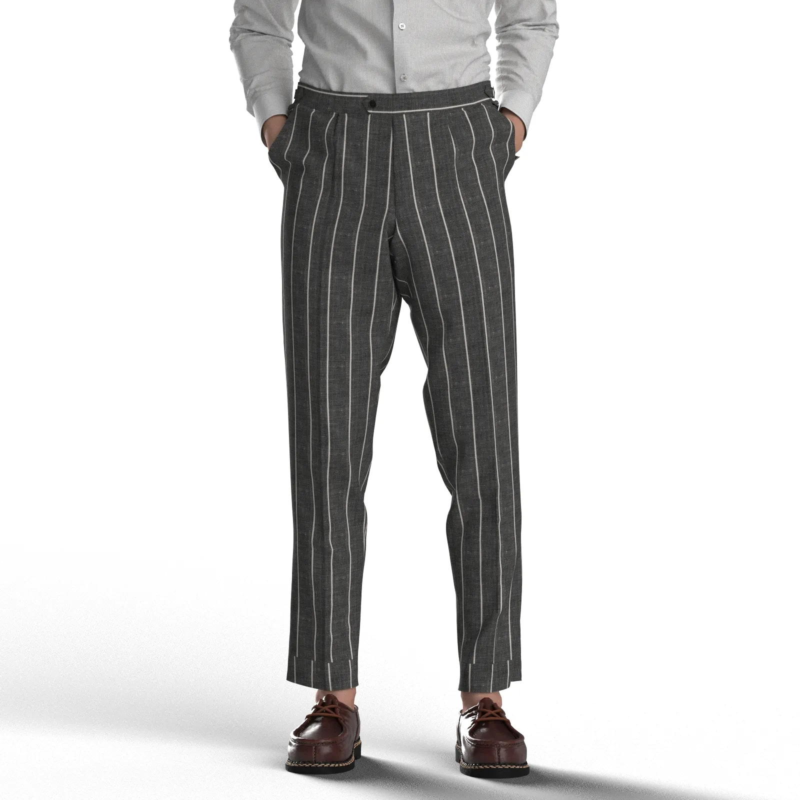 詳細ベーシックでストレッチ性のあるリネン混のグレーにホワイトのストライプ生地です。